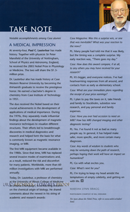 Profile, interview, and photo of Paul C. Lauterbur, University of Illinois professor of chemistry, regarding Dr. Lauterbur's being awarded the Nobel Prize in 2003 for development of the MRI.