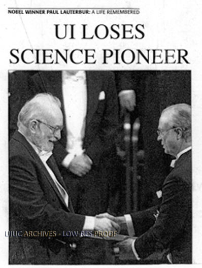 University of Illinois professor of chemistry, Paul Lauterbur, accepts the Nobel Prize, which he was awarded for his efforts in the development of the MRI. This image accompanied an obituary for Dr. Lauterbur.