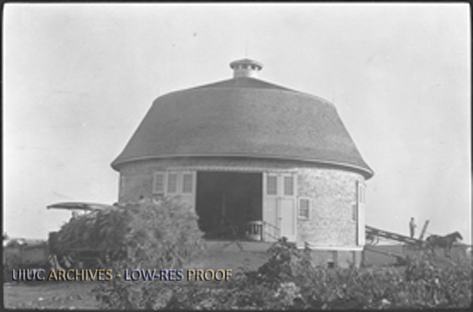 One of the round barns on the University of Illinois campus seen with its doors open and several carts around, including on in the background right with a man on it and attached to a horse.