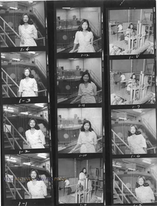 Contact sheet of 12 images of Patricia Eng, the first student to graduate with a Bachelor's Degree in nuclear engineering at the University of Illinois. The reverse of the image contains a biography of Ms. Eng and explains the Nuclear Engineering Program at the University.