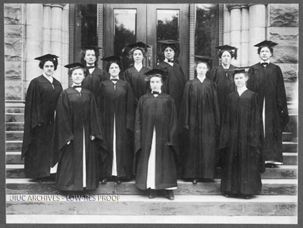 Group photo of the Senior Class of the Library School for the 1911-12 academic year, dressed in academic attire and standing on the steps of Altgeld Hall, where the Library was located. In front, from left to right are Renz, Mathis and Knapp. In the second row are Felsenthal, Brooks and Langdon. In the third row are Oaks, Fehrenkamp, Morton, Plummer and Robison.