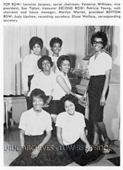 Seven members of the Alpha Kappa Alpha Sorority at the University of Illinois, including president, vice president, corresponding secretary, recording secretary, social chairman house manager / rush chairman and treasurer.