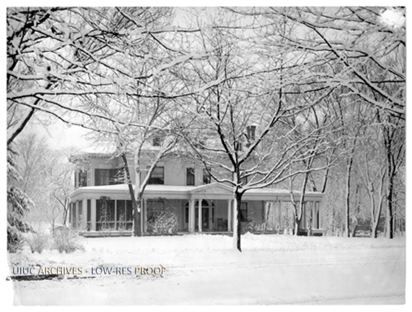 Snow-covered President's House at the University of Illinois, located on the northeast corner of the intersection of Green and Wright Streets.