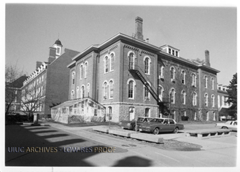 Harker Hall on the campus of the University of Illinois, viewed from the southeast, showing details of the east and south facades, with the Illini Union in the background.