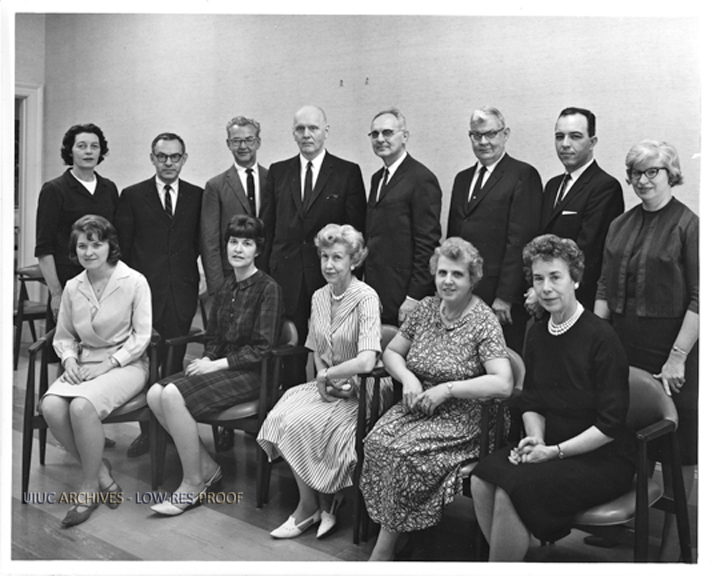 Faculty of the Graduate School of Library Science. Front row, left to right: Unknown, Unknown, W. Ladley, A. Lohrer, F. Jenkins. Back row, left to right: Unknown, H. Goldstein, R. Stevens, Robert B. Downs, Herbert Goldhor, D. Carroll, Kathryn Henderson.