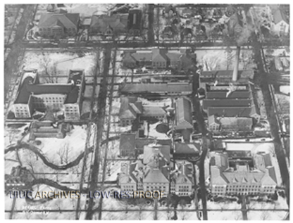 Aerial view, with north to the top, of north campus at the University of Illinois bounded by Wright Street on the to the west, a short distance north of Springfield Avenue to the north, Mathews Street to the east, and Green Street to the South. Buildings included in this image are, from left to right and top to bottom, The Men's Gymnasium, the Gym Annex, the Wood Shop and Foundry, the Materials Testing Laboratory, the Metal Shop and Forge, the Power Plant, the North Greenhouses, the Electrical Engineering Lab, the Health Services building, Engineering Hall and the Physics Building. Note the snow on the ground and the Boneyard Creek running through the north campus.