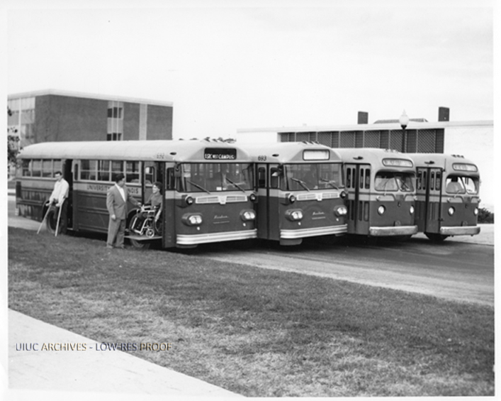 Two students exit one of four accessible bused lined up on a campus street at the University of Illinois.