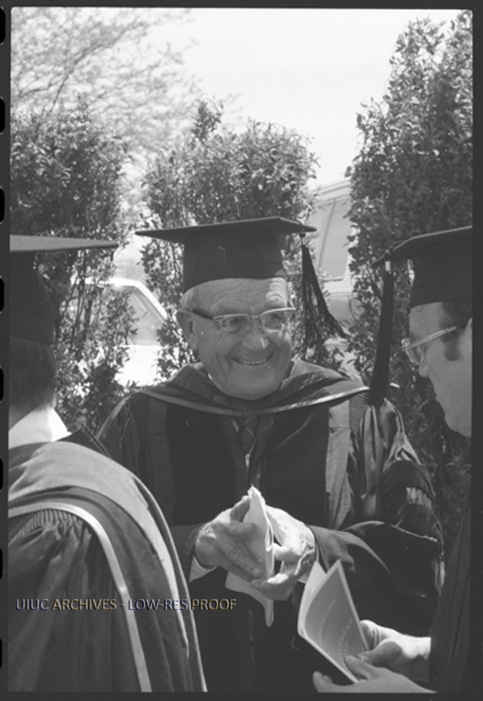 Charles J. Merriam, president of the Board of Directors of the University of Illinois Foundation (1976-78), photographed in academic attire.