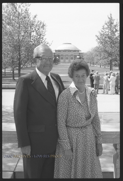 Charles J. Merriam, president of the Board of Directors of the University of Illinois Foundation (1976-78), and his wife stand for a photo with the Main Quad and the Auditorium as a backdrop.