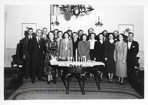 Members at the founding of the Alpha Chapter of Beta Phi Mu, a library honors society started in 1948 by a group of leading librarians and library educators to recognize and encourage scholastic achievement among library and information studies students. Original located in RS 18/1/43, Box 1, Folder 1.