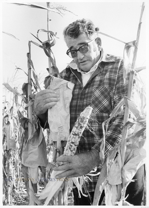 John Laughnan, University professor of plant biology stands among corn stalks which are identified as part of his studies of plant genetics and biotechnology.