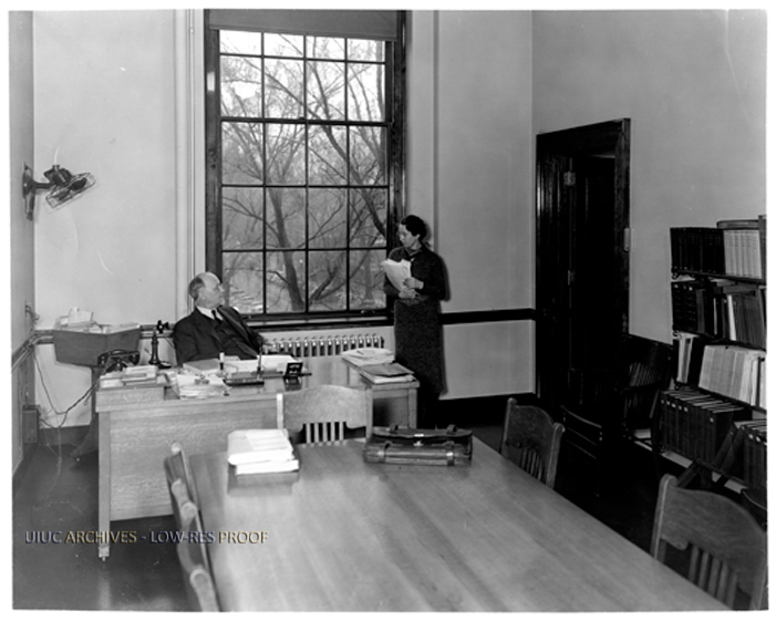 Photograph of Phineas Windsor, University Librarian and Mary Lois Bull, Director of Library Personnel, presumably in Prof. Windsor's office.