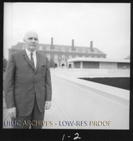 Robert Downs, University Librarian, stands outside the Undergraduate Library with the Main Library in the background.