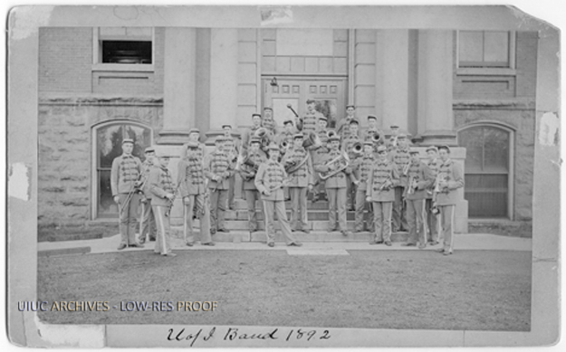 Twenty-six young men who make up the University of Illinois Band, stand with their instruments on the steps of University Hall.