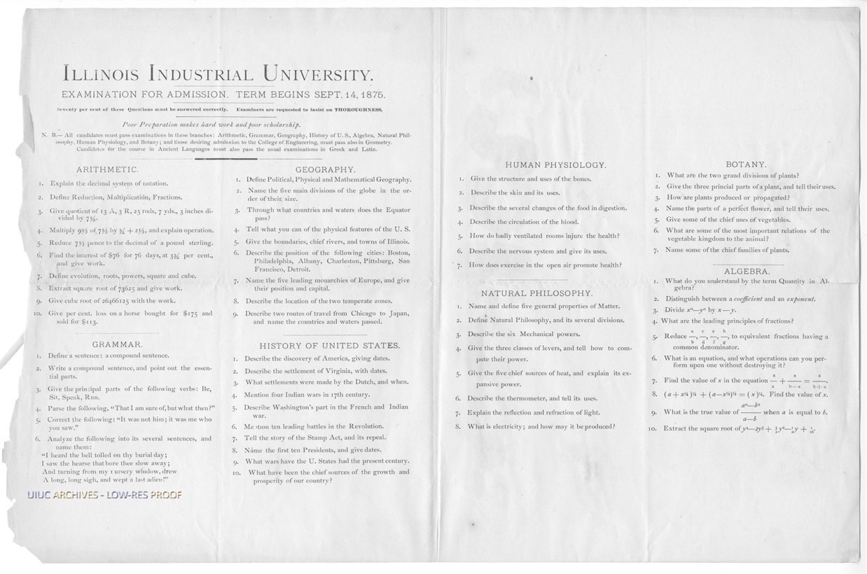 Entrance exam used by the Illinois Industrial University to gauge students' aptitude for those seeking entrance to the University in Fall of 1875.