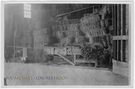 Large stacks of hay are stacked behind a mechanical baler inside an unidentified round barn, presumably on the campus of the University.