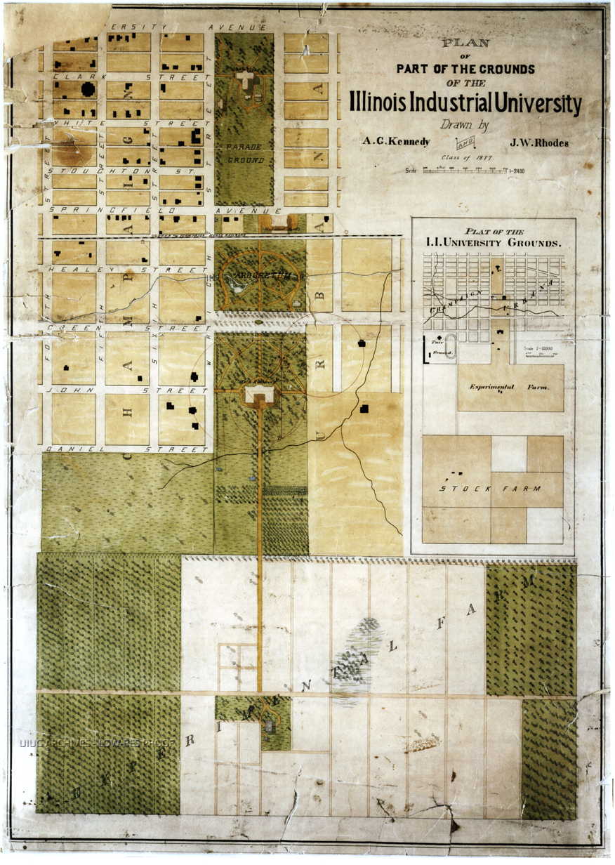 Photographic reprint of a map of the grounds of the Illinois Industrial University including the Old University Building (the Elephant) to the north, the Parade Grounds, the Arboretum, University Hall, and the Experimental Farm to the south with an inset showing the wider expanse of the University. University students A.C. Kennedy (B.S. 1877) and J.W. Rhodes (B.S. 1876) were paid ten dollars by the University for their work on this plan (see BOT Report, June 7, 1876, p. 188).