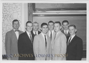 Caption accompanying photo reads, "Left to right: A. W. Burger, Advisor; J. P. Mitchell, Jerry Brookhart, Randall Peterson, Don Beitz, Den Eike, B. R. Sabey, Advisor; Dave Schingoethe."