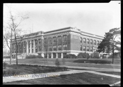 View, facing northeast across Green Street, of the Champaign High School, a building that is later Edison Middle School.