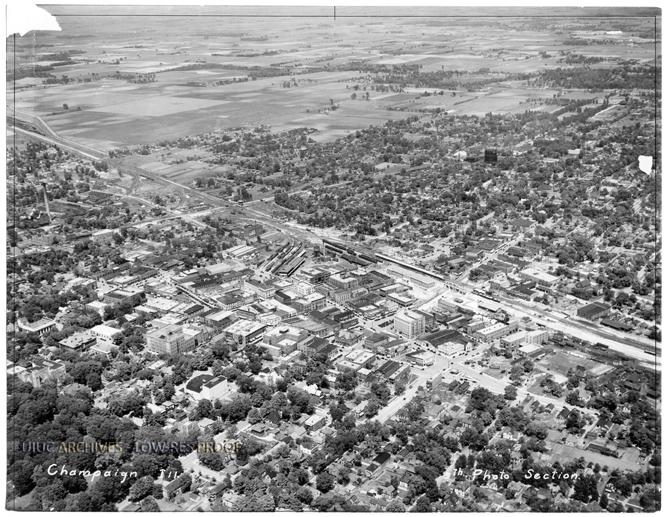 Aerial view, from the southwest, of Champaign, approximately bounded by State Street to the west, White Street to the south and extends into Champaign County and Urbana to the north and east.