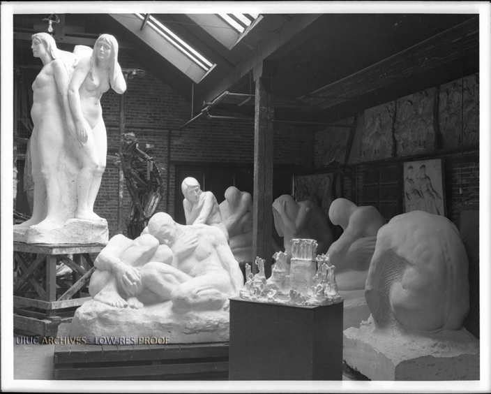 Figures from Lorado Taft's Fountain of Creation inside a studio.