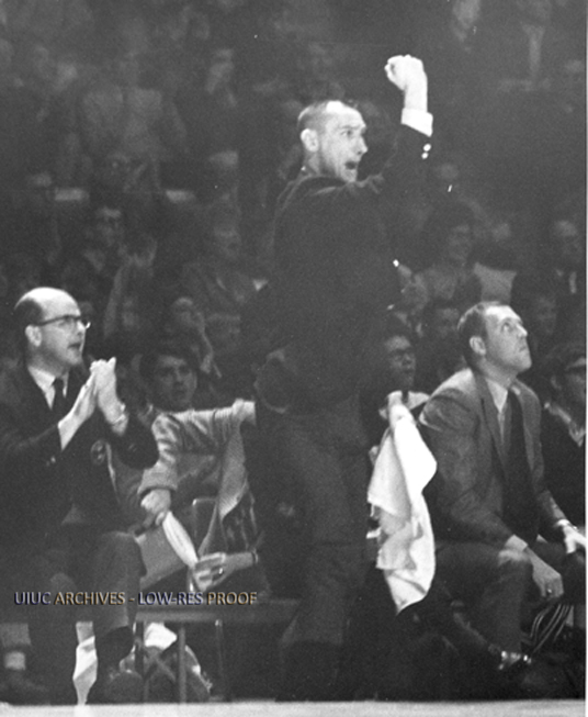 Basketball Coach Harv Schmidt celebrating a good play | University of Illinois Archives