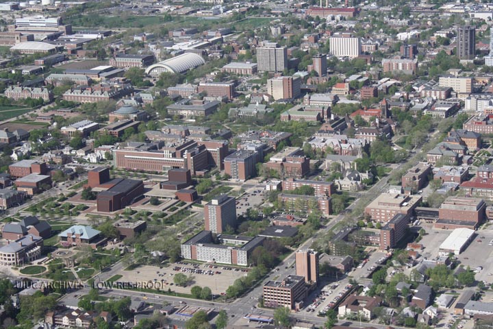 Aerial view, towards the southwest, of the University of Illinois campus bounded by Lincoln Avenue to the east and Green Street to the north and extending south and east towards the Stadium Terrace area and Neil Street with the Main Quad in the center of the image.