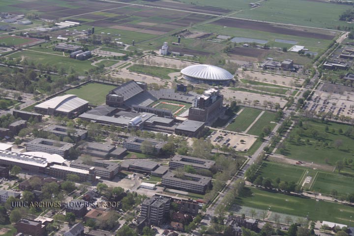 Aerial view, towards the southeast, of Memorial Stadium and Assembly Hall with the Champaign Residence Halls and the South Farm agriculture facilities visible.