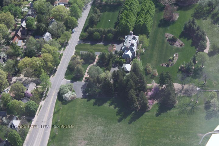 Aerial view, towards the east, of the President's House and grounds on the campus of the University of Illinois.