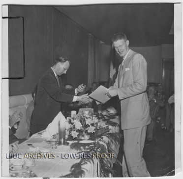 Photo appears in Champaign-Urbana Courier for March 1952 with caption: "Long John Kerr, Illinois' top scorer this season to date, receives his letter from Coach Harry Combes at the annual Champaign-Urbana Kiwanis banquet Monday evening."