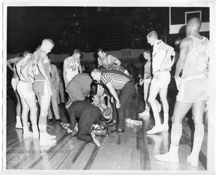 Members of the Philadelphia 76ers and the Los Angeles Lakers stand around two injured players who lay on the floor. A doctor in a plaid blazer kneels over one player, touching his head. His doctor's bag sits at his side. The referee crouches between the players. John Kerr, number 10, for the 76ers, looks at the injured Los Angeles player.