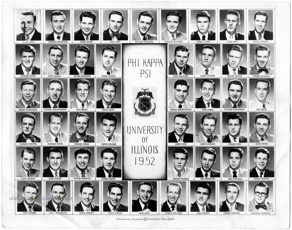 Headshots of the University of Illinois' Phi Kappa Psi Fraternity members for 1952.