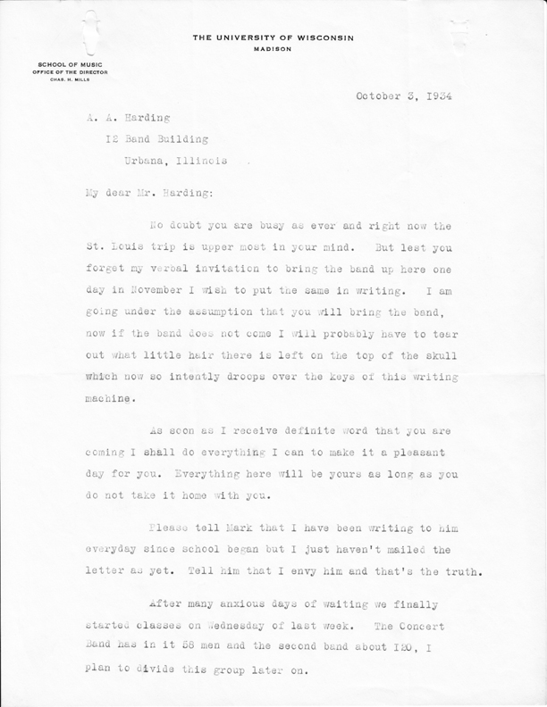 Type written correspondence by Ray Dvorak, former assistant director at the University of Illinois, bemoaning the finances, equipment, and band library at the University of Wisconsin-Madison, after accepting a position as director of bands there in 1934.