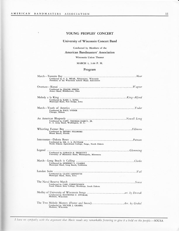 American Band Masters Association Young Peoples Concert Program, University of Wisconsin.