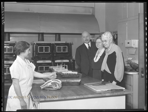 Isabel Bevier and two other unidentified people inspect the foods lab, where a young woman explains a cut of meat.