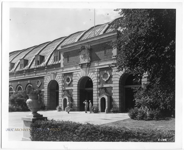 Caption on reverse reads: "Armory, headquarters of the Reserve Officers' Training Corp. Since the University opened in 1868 it has requires two years of military training of all men students unless specially exempted. Many pursued it for the full four years. At the time of Pearl Harbor, 500 Illini graduates were immediately available as officers. This training was taken over by the Army ROTC after World War I. In 1945 the Navy ROTC unit was established. In 1949 the Air Force ROTC was added. Branches of the ROTC also are on the University's campus in Chicago. Total ROTC enrollment this year exceeds 4,800. Student may take four years of training and thus earn commissions in the service of their choice."