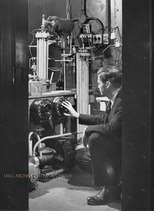 Prof. Comings Looks Over Apparatus Used to Study Diffusion of Matter | University of Illinois Archives