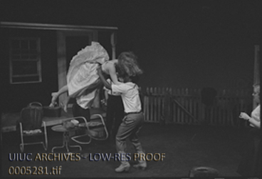 Image of Hal Carter (Eric Pierson) lifting Madge Owens (Susan Knight) from William Inge's Picnic, a show at the Krannert Center for the Performing Arts.