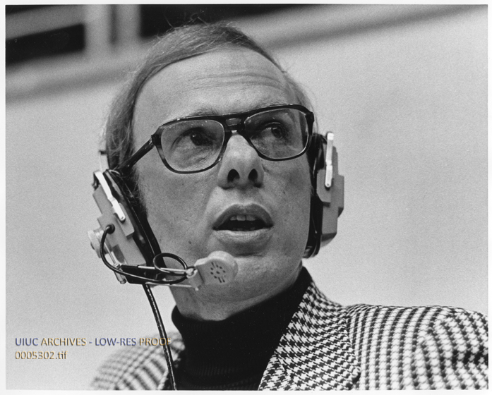 Tom Jones, pictured here doing commentary for a NWBA basketball game, played wheelchair basketball for both the U of I (1959 BA Communications, 1971 MA Television) and the Champaign-Urbana Black Knights. He was a world-record holder in wheelchair track competitions for the U of I. His success extended to his professional career as well-from 1957 to 1975 he held several positions for WCIA Television, including writer, producer, director and sports director. He hosted an early morning talk show called "Sun Up" and also announced play-by-play and color commentary for Big Ten basketball for television and Big Ten football for radio. In 1971, he was named Illinois Handicapped Citizen of the Half-Century.