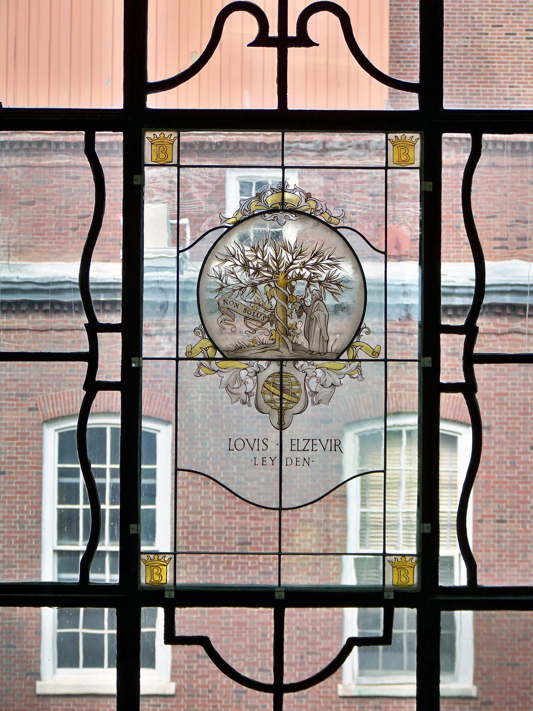 Tinted glass window in the Library Reference Room depicting the device used by the printer Louis Elzevir, as interpreted and designed by J. Scott Williams.