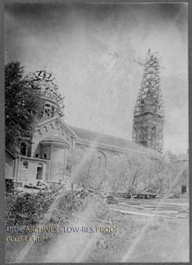 Photograph showing exterior of the Church of the Assumption under construction, building designed by George P. Stauduhar, architect of Rock Island, IL.
