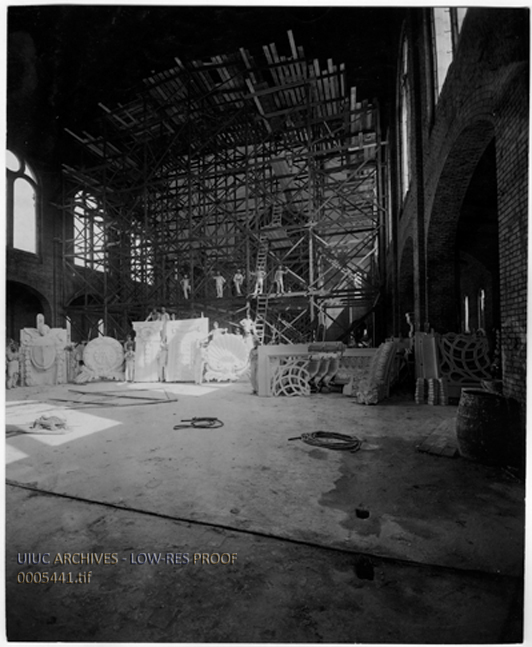 Photograph showing interior of St. Benedict's chapel under construction. Building designed by George P. Stauduhar, architect of Rock Island, IL.