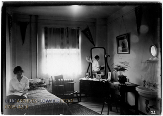 Photograph showing interior of dorm room with unidentified student at Sacred Heart Academy. Building designed by George P. Stauduhar, architect of Rock Island, IL.