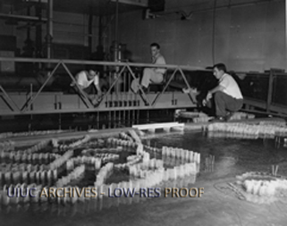 Caption on back: Models of Ill. Highway-460 bridge over Wabash River flood plain to New Harmony, Ind. Built by U. Ill. engineers who found way to tame eddy which threatened to drop bridge into 40-foot deep hole. Solution is 100-foot upstream dikes dire