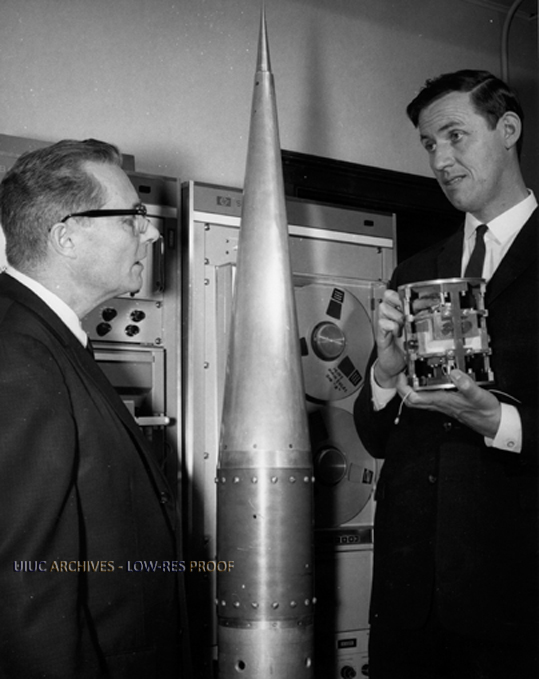 Caption on back: Prof. Edward C. Jordan (left), head, Department of Electrical Engineering in the University of Illinois at Urbana, and Prof. Sidney A. Bowhill discuss special antenna for aeronomy research which will be fitted into section just behind nose cone of a rocket like that between them and shot into the radio-reflective ionosphere 100 miles above the earth. Resulting taped records of ion density and other characteristics will be analyzed with equipment in background.