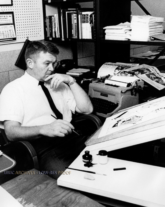 Caption on back: "Drawing Conclusions" each week on University of Illinois station WILL-TV, Channel 12 is Prof. Gene S. Graham. A Pulitzer Prize winner, Graham teaches public affairs reporting and editorial cartooning in the U. of I. College of Journalism.