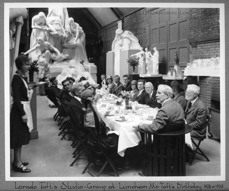 Photo of a group at luncheon in the court of Lorado Taft's Chicago studio, on the occasion of Mr. Taft's birthday in 1928 or 1930. Lorado Taft is seated at front right; at his left is Mrs. Lorado Taft. Background left is a large model for Taft's Fountain of the Great Lakes; also visible are models for the Alma Mater, Fountain of Time, and Fountain of Creation.