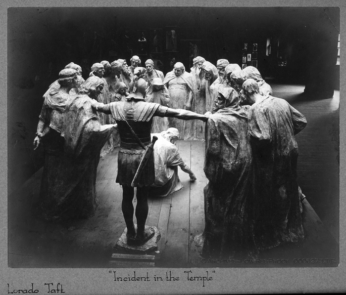 Photo of the sketch model for An Incident in the Temple, a project for Lorado Taft's life class at the Chicago Art Institute. Fragments of this model were sent to Champaign.