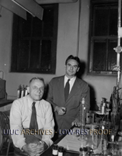 Caption on back: Dr. Otto H. Warburg (left), famous German bio-chemist, 1931 Nobel Prize winner for work on cancer and enzymes of respiration, and famous for research in photosynthesis, who is 1948-49 visiting professor at University of Illinois, with Professor Oswald Tippo, acting head of Botany Department at Illinois.