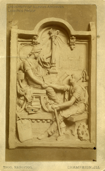 Photograph of a sketch model by sculptor Lorado Taft for a relief of Learning and Labor, intended for the University of Illinois.